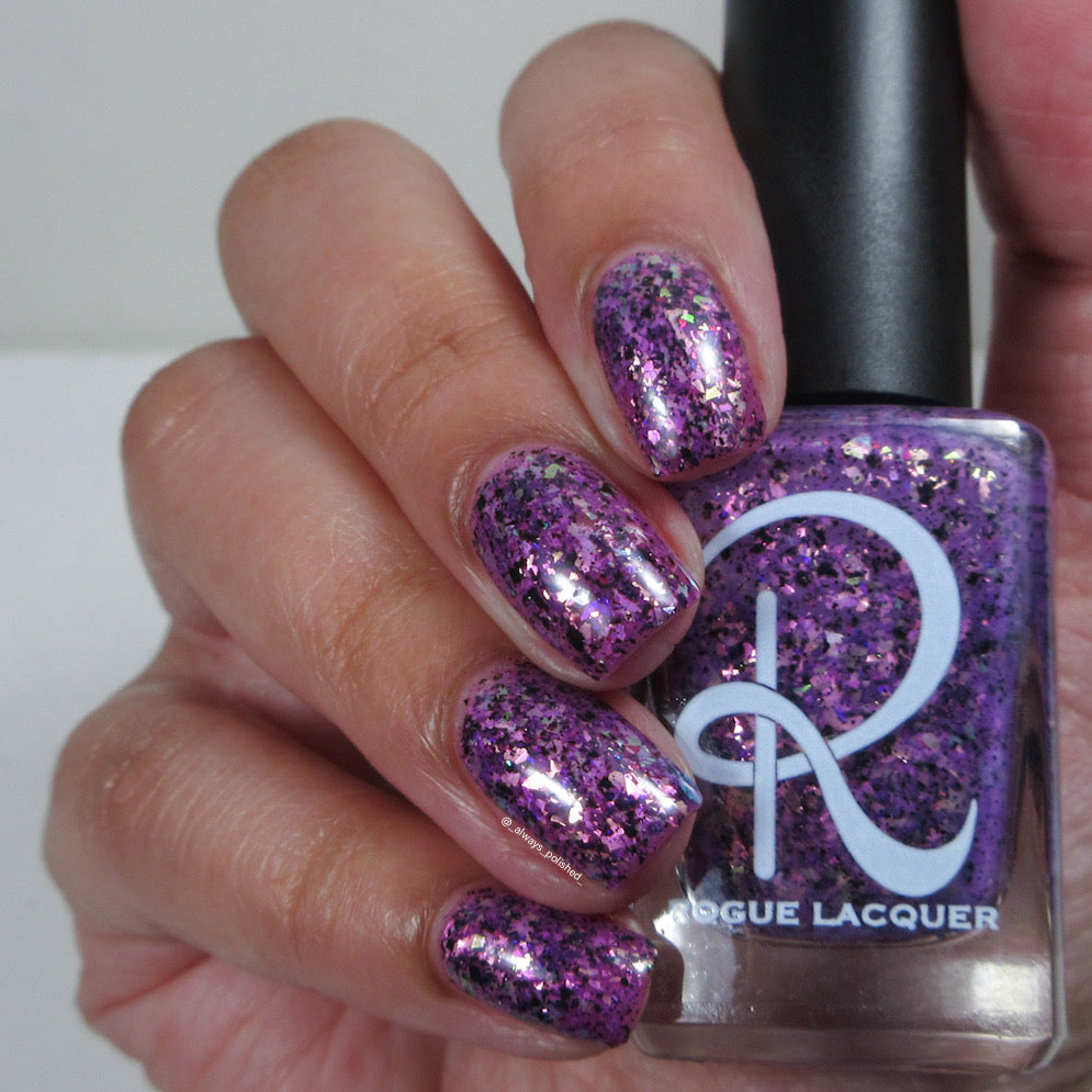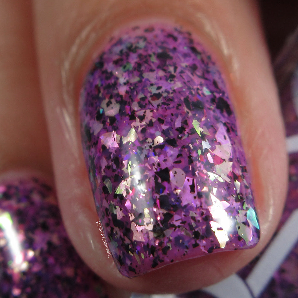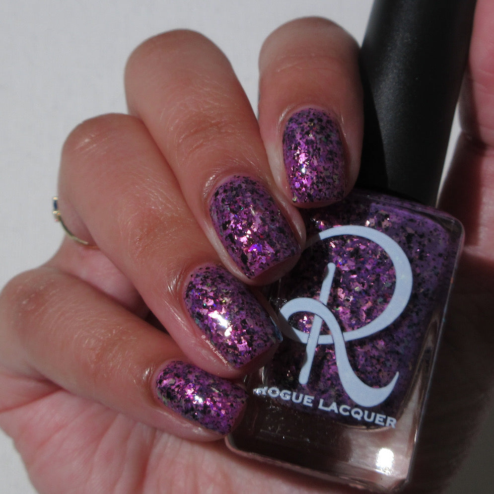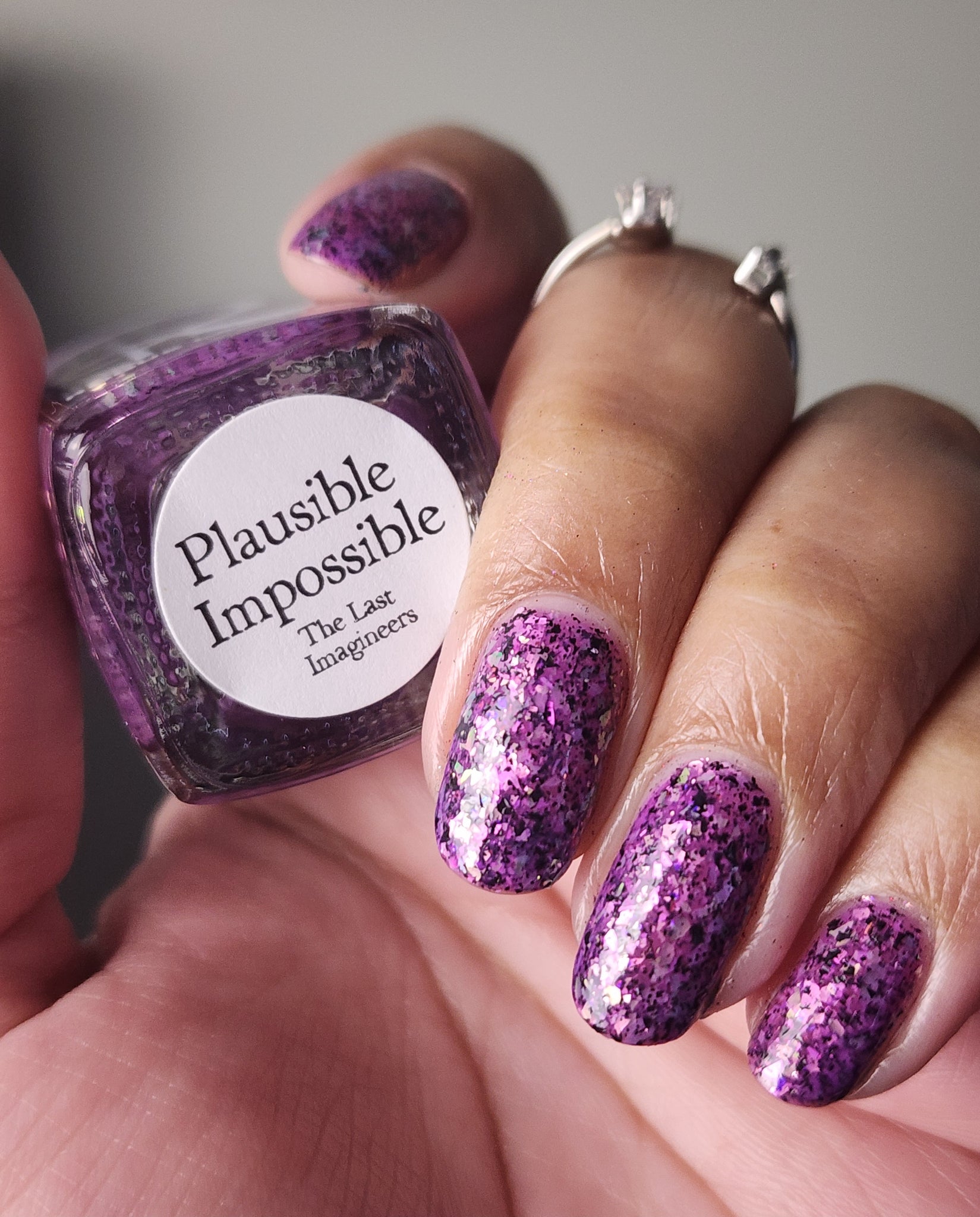 Plausible impossible is a plum base with lavender green gold color, shifting flakes and black metallic flakes