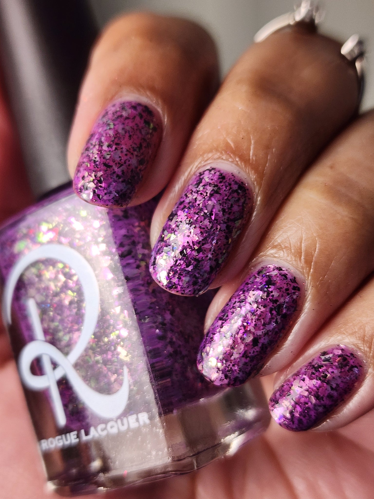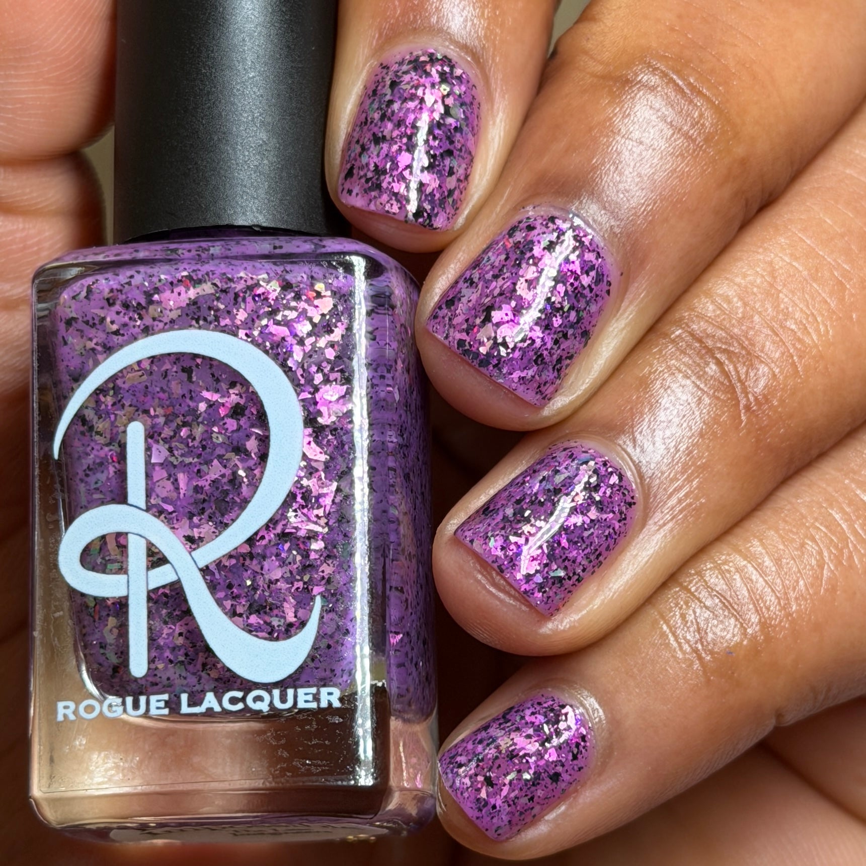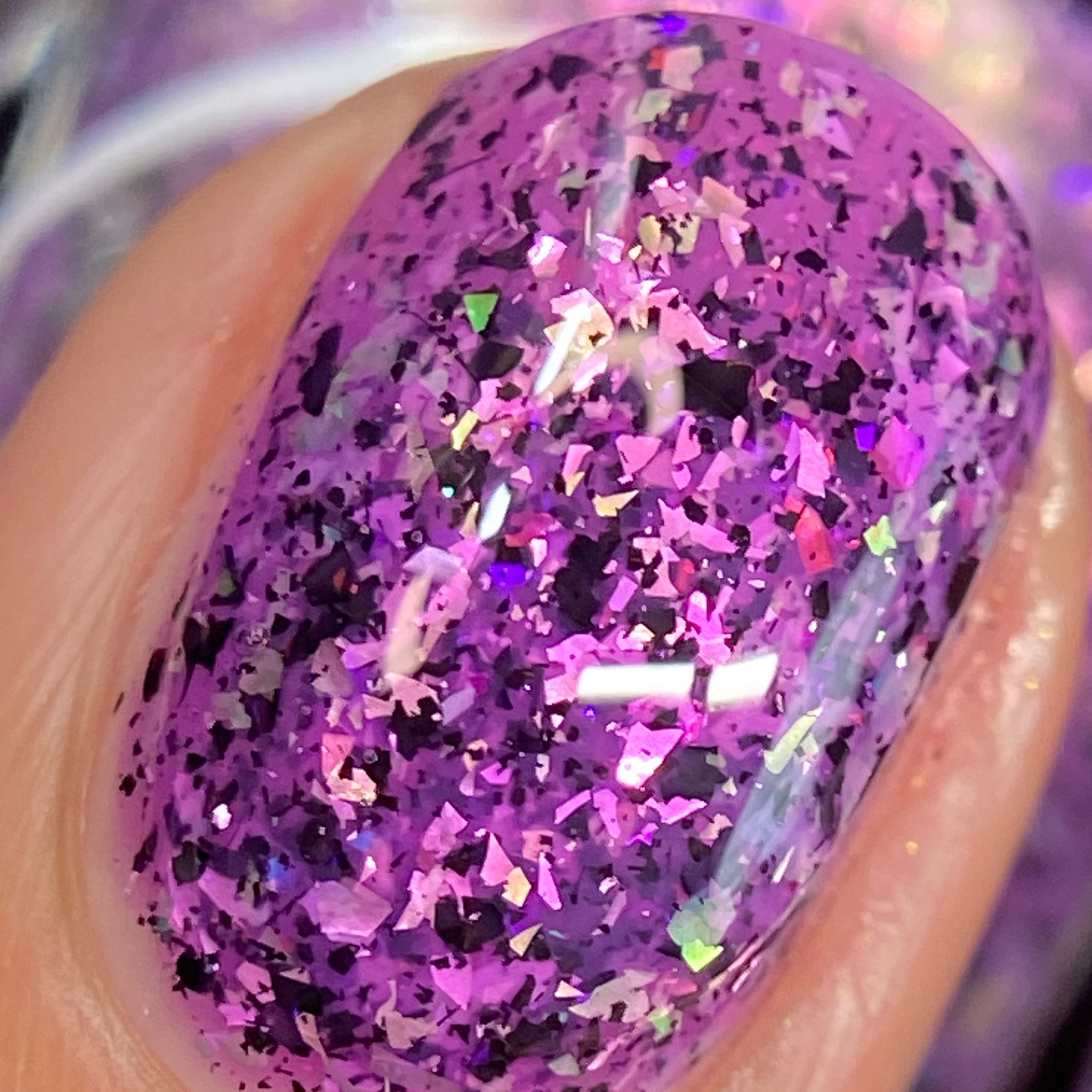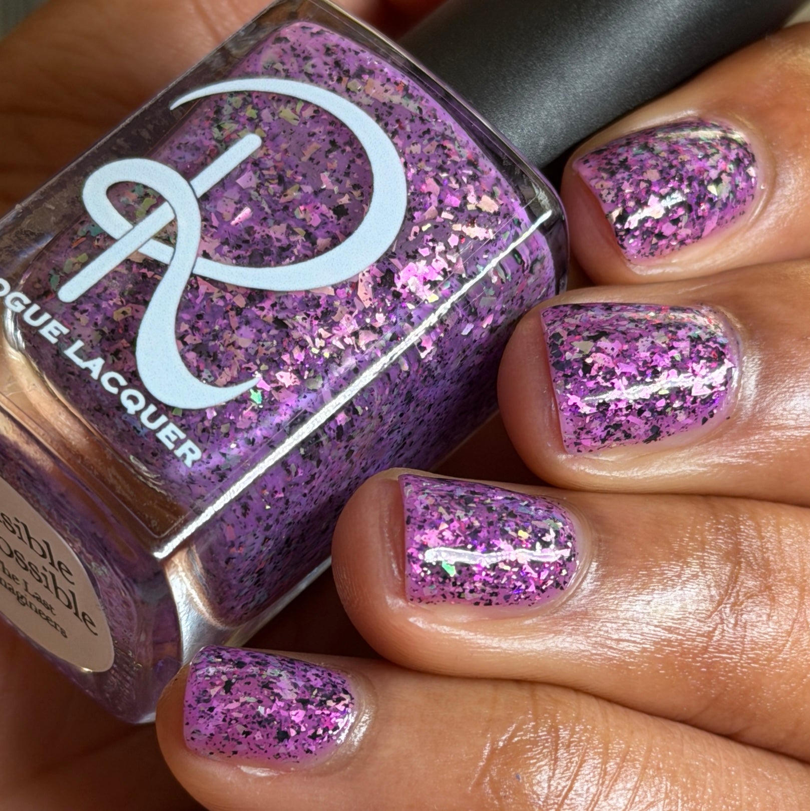 Plausible impossible is a plum base with lavender green gold color, shifting flakes and black metallic flakes